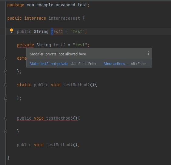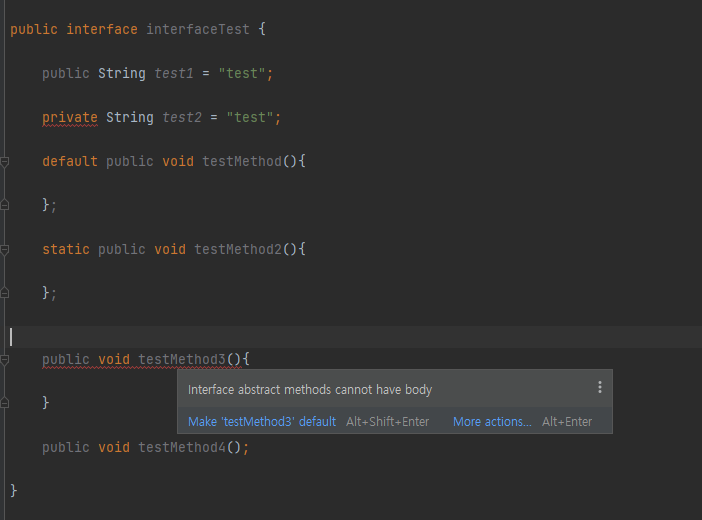 interface 안에 method의 body를 선언하려면 오류가 난다.