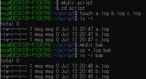 그리고 touch a.log b.log c.log로 log 파일 3개를 script 디렉토리에서 생성!
