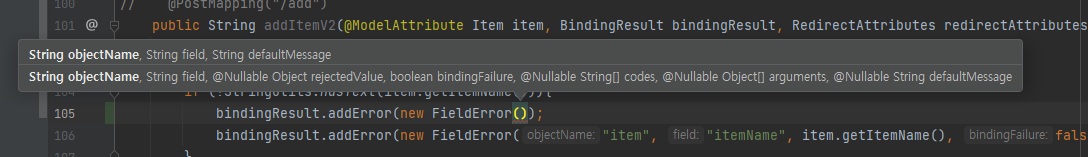 addError 내에서 FieldError를 선언해서 사용하는 경우 너무 많은 값을 넣어줘야해서 개발자 입장에서 불편했다.