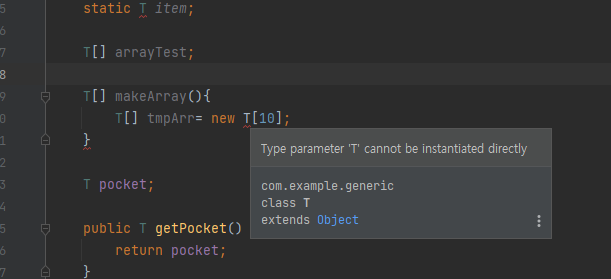 또한, 제네릭은 배열 참조변수 선언은 가능하지만 배열을 생성하는 것은 안됀다.