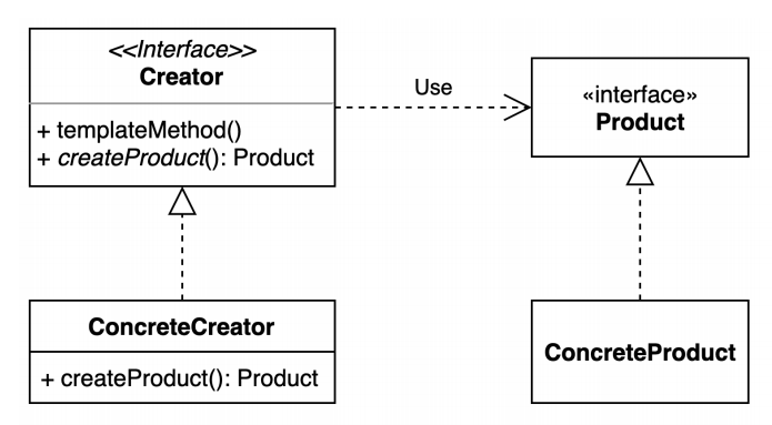 - Creator : Product타입의 객체를 반환하는 팩토리 메서드를 선언. 기본적으로 팩토리 메서드를 구현해서 ConcreteProduct 객체를 반환. 또한, Product객체 생성을 위해 팩토리 메서드를 호출