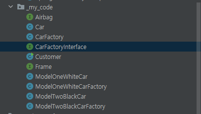 우리가 생성한 Product인 CarFactoryInterface를 위 두개의 클래스가 상속해서 인터페이스를 구현하고 있다.