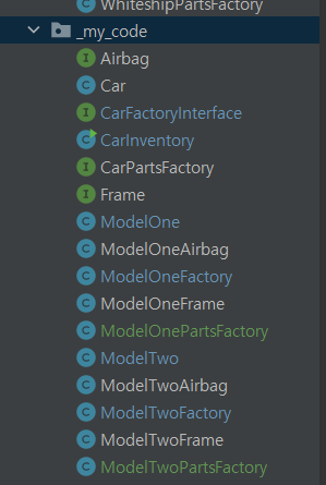 CarPartsFactory가 있고, 이를 ModelOnePartsFactory에서 상속받는다. 이 인터페이스를 구현하는 곳에서는 ModelOne에 해당하는 ModelOneFrame, ModelOneAirbag를 오버라이드한 메소드에서 반환한다.