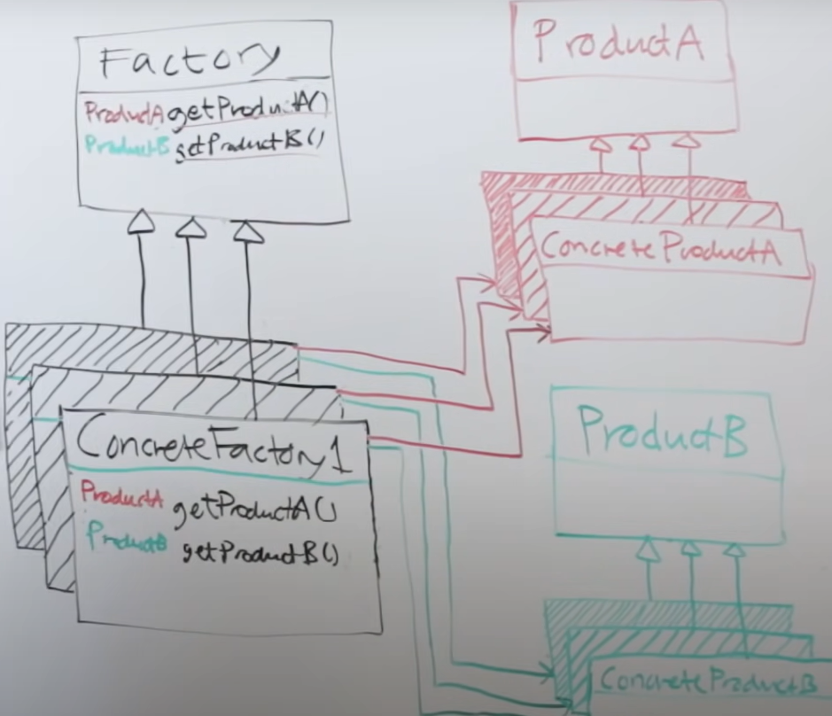 - Abstract Product : 개념적 제품 객체에 대한 인터페이스를 정의 (여기서는 ProductA, ProductB)