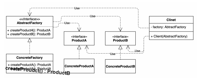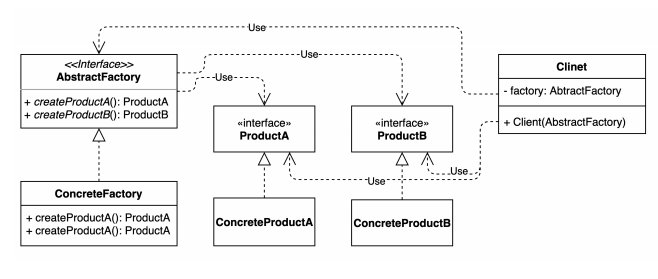 - Client : Abstract Factory와 Abstract Product 클래스에 선언된 인터페이스를 사용