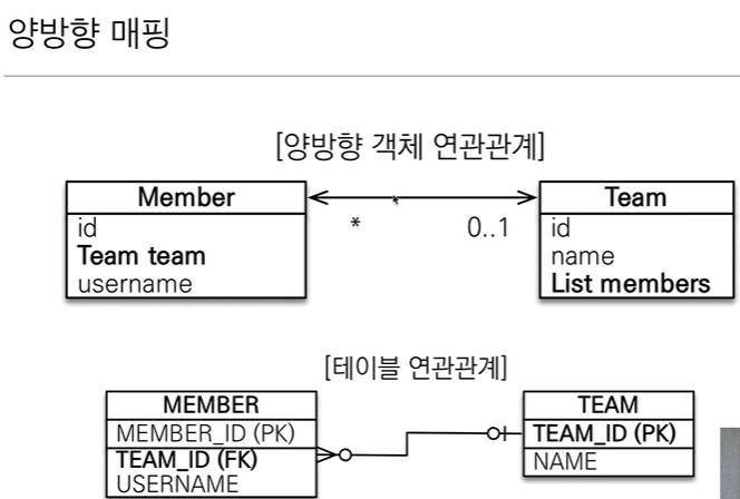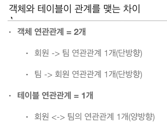 객체의 양방향 관계는 사실 양방향 관계가 아니라 서로 다른 단방향 관계 2개다.