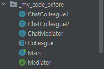 - ConcreteMediator : Colleague 객체와 조화를 이뤄서 협력 행동을 구현, 자신이 맡을 동료를 파악하고 관리