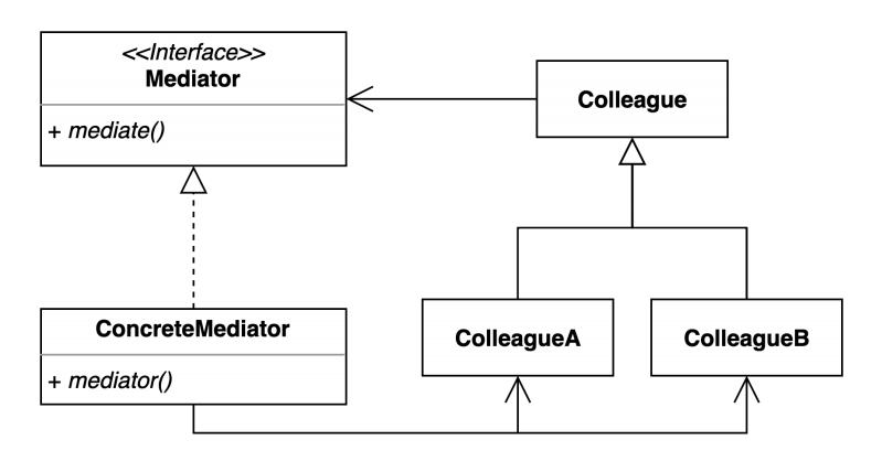 - Mediator : Colleague객체와 교류하는 데 필요한 인터페이스를 정의
