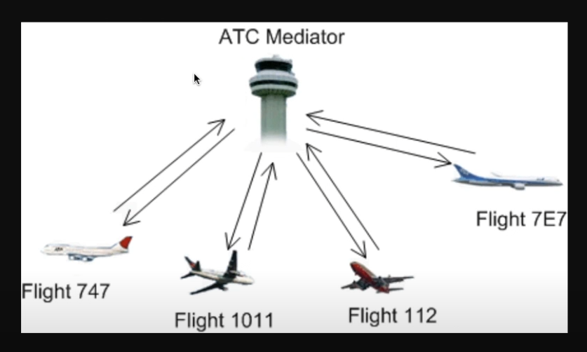 다음 그림은 youtube에서 참고한 것인데 Mediator 패턴을 생각할 때 항공기 관제탑이라고 생각을 하면 편하다.