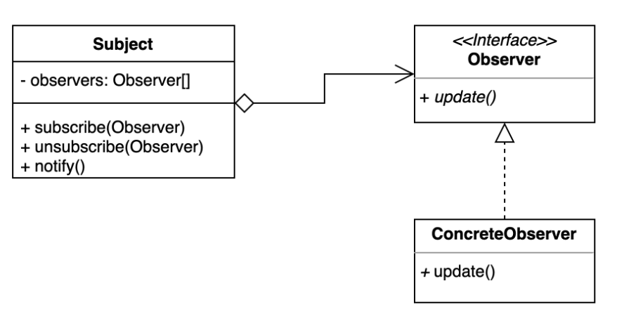 - Subject : 감시자들을 알고 있는 주체. 임의 개수의 감시자 객체는 주체를 감시할 수 있다. 주체는 감시자 객체를 붙이거나 떼는 데 필요한 인터페이스를 제공.