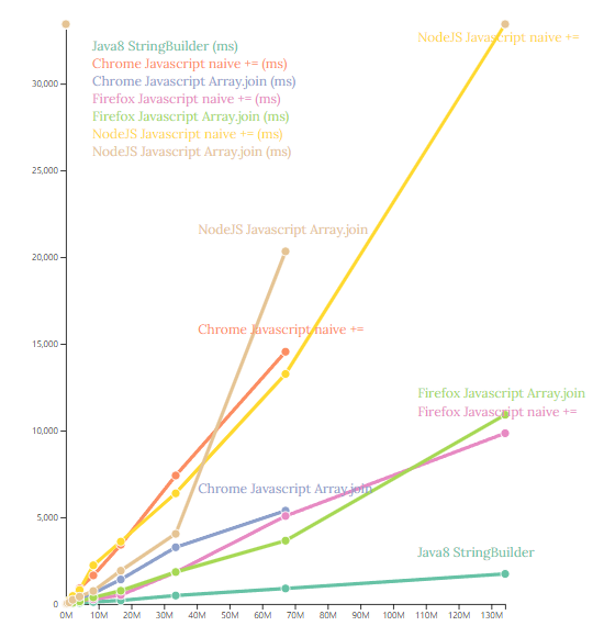 Javascript의 growth는 선형처럼 보인다. 그래프를 조사해보자. 단순한 java concatenation은 너무 빠르게 grow하고, 스케일이 남아있는 메소드의 grwoth를 분석하기 어렵게 만들어서 그래프에서 제외했다.