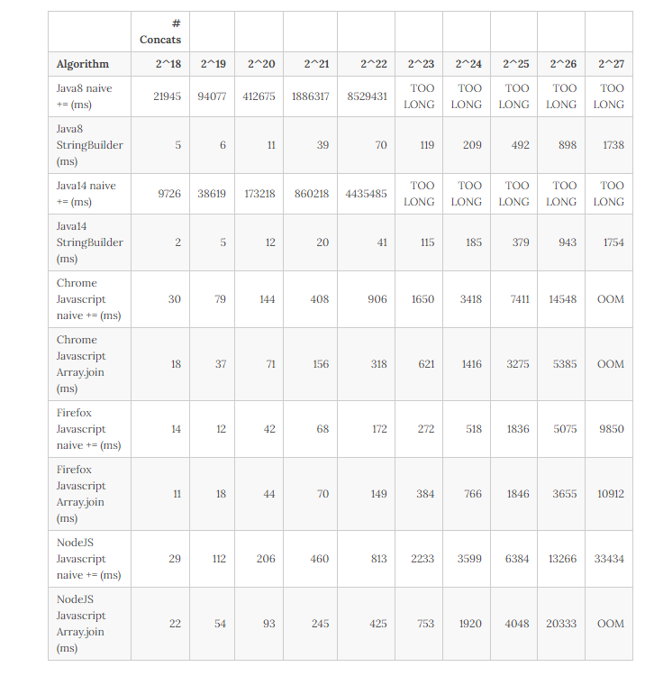 오늘 필자(위 사이트의)는 많은 수의 concatenation을 위해 StringBuilder가 js에서 필요없다는 것을 배웠다.