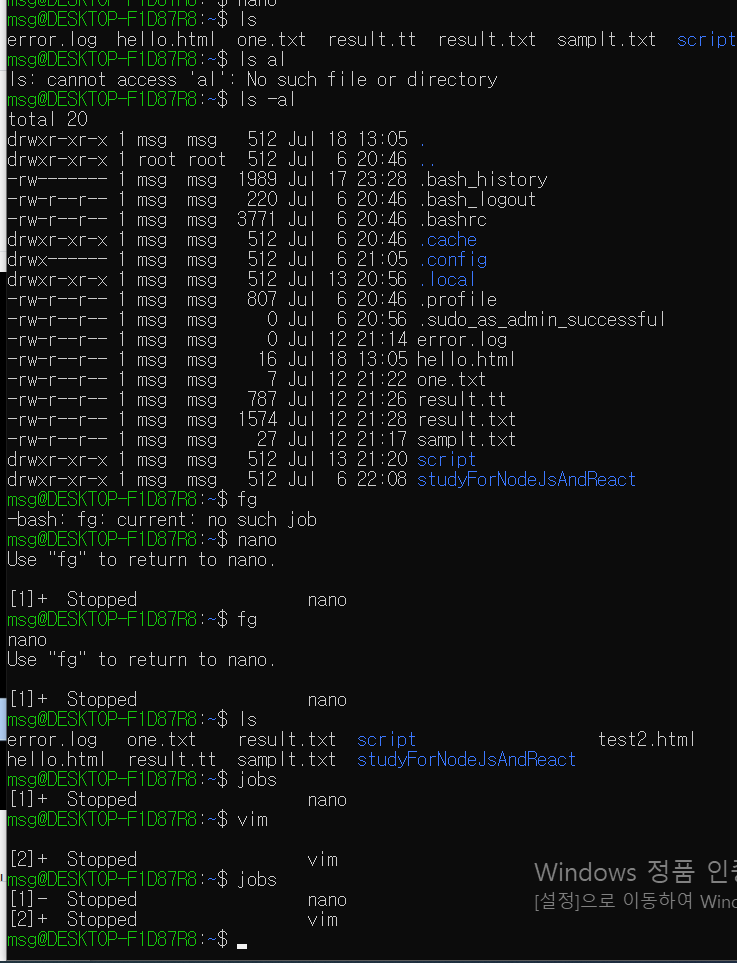nano에서 파일을 생성하고 ctrl + z 를 클릭하면 Use "fg" to return to nano