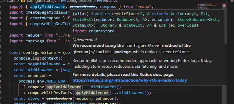 이게 deprecated되어서 redux-toolkit을 사용하라고 버젓이 적혀있다.