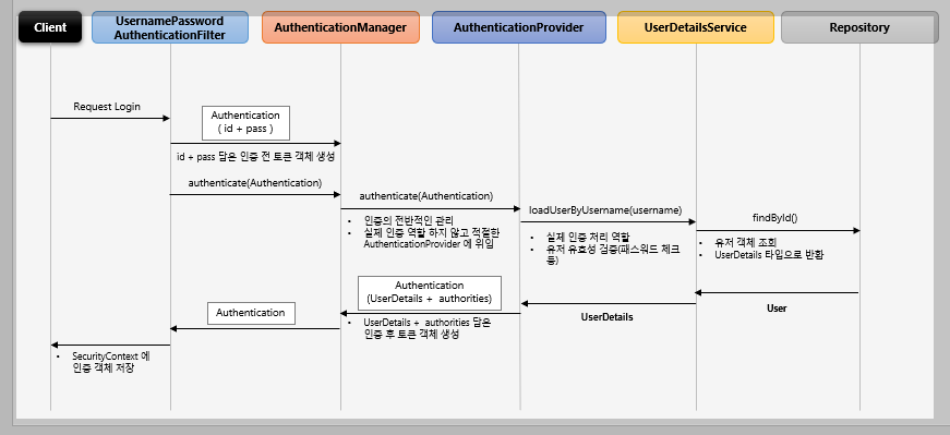 그리고 다시 Authentication에서 principal, credentials, authorities같은 정보를 가지고 있다.