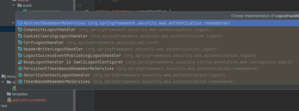 찾아보니 이렇게 LogoutHandler를 구현한 구현체들을 확인할 수 있었다.