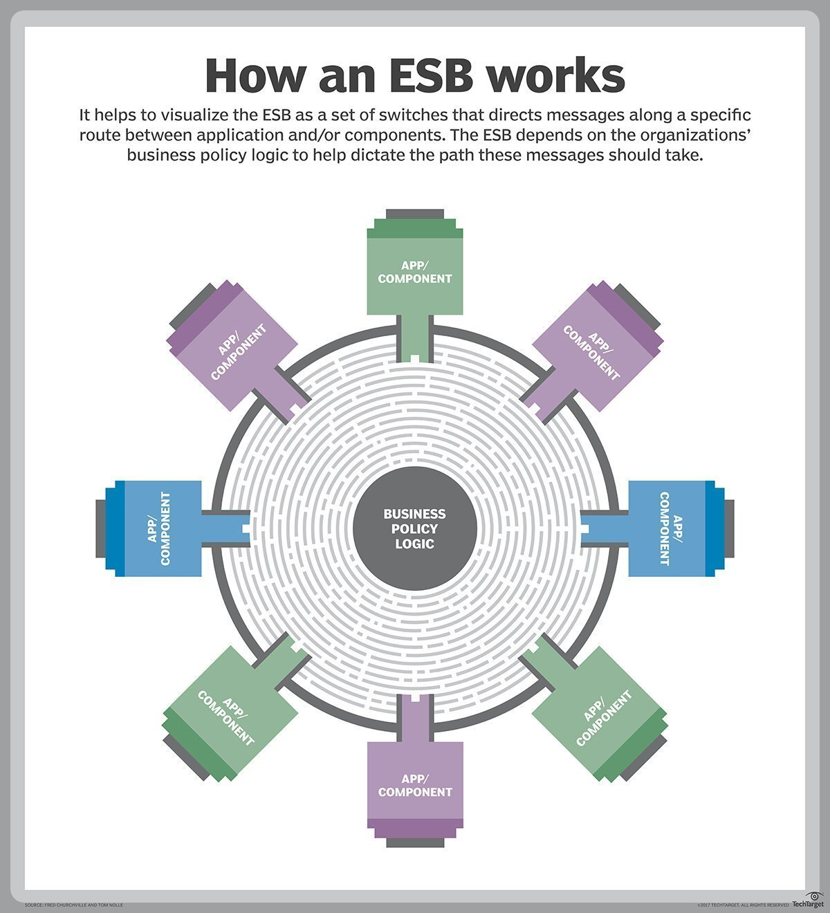이는 작업을 이동하는 균일한 수단을 제공하도록 설계되었으며, 간단한 구조 및 비즈니스 정책 규칙을 기반으로 ESB에 연결하고 메시지를 구독할 수 있는 기능을 애플리케이션에 제공한다.