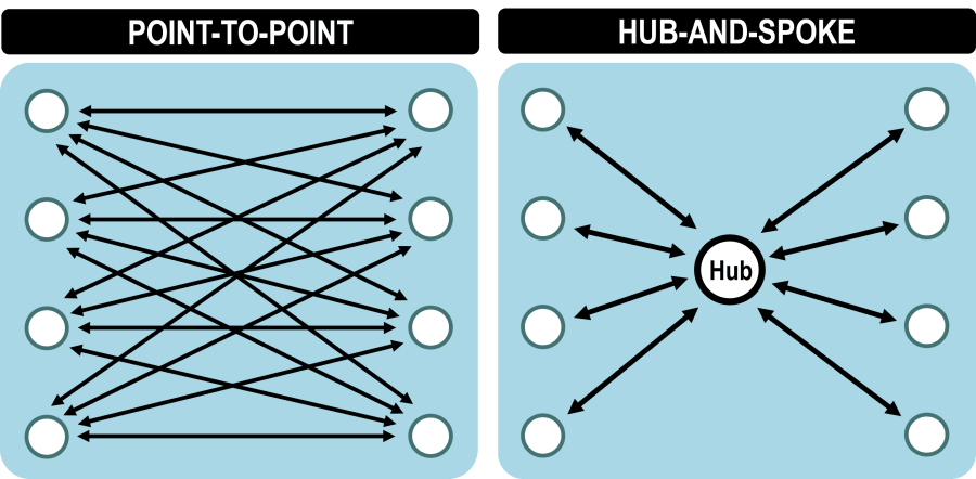 Hub-and-spoke는 그러므로 point-to-point보다 더 빠르고 믿을만 하지만 설치하고 유지할 노력과 개발 시간을 필요로 한다.