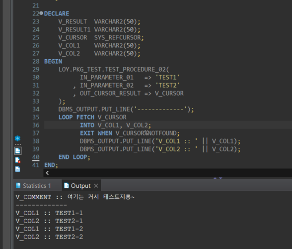 INTO V_COL1, V_COL2; -- 전달받은 커서의 컬럼 항목만큼 변수 선언해야함!