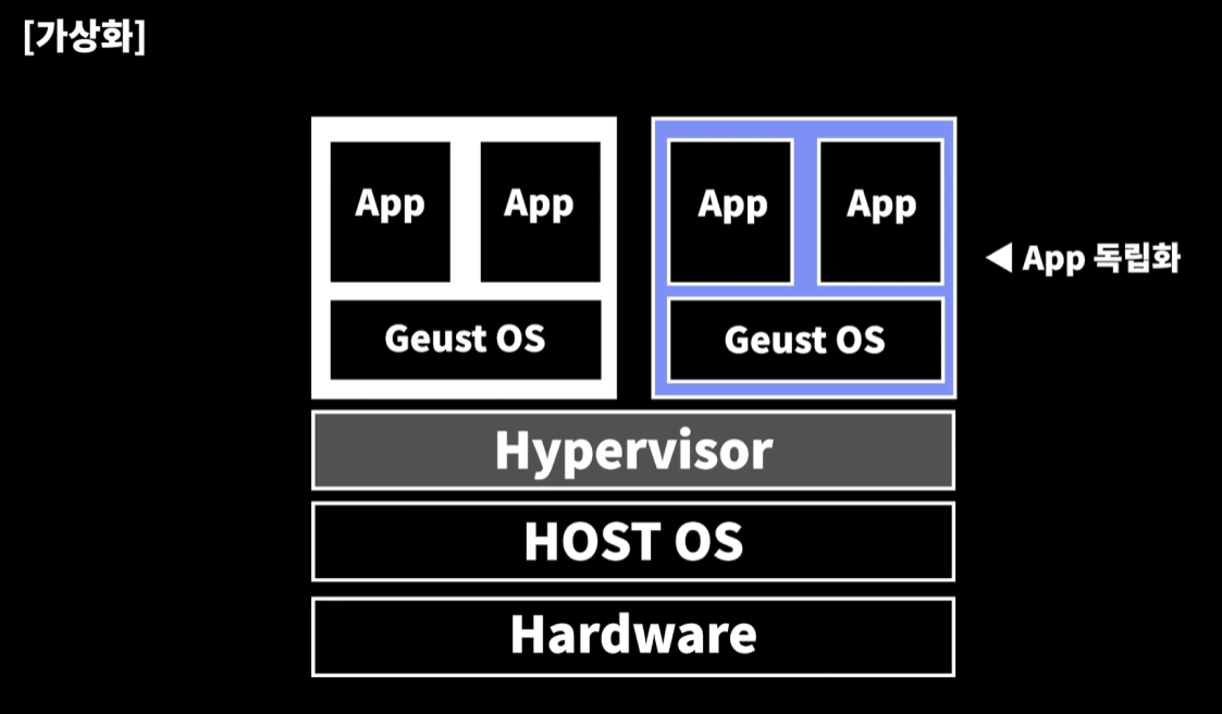 이를 하이퍼바이저(Hypervisor)라는 소프트웨어 기술을 가지고 가상화된 컴퓨터 위에 독립적으로 어플리케이션들을 운영하기 시작한다.