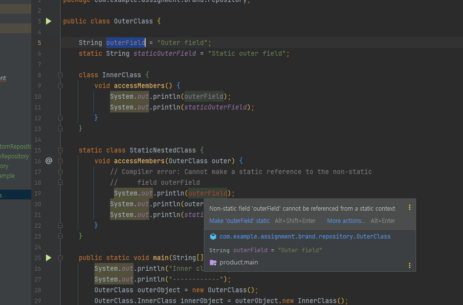 해당 코드에서 outerField를 Static Nested Class에서 출력하려니 다음과 같이 컴파일 에러가 난다.