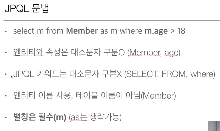 - JPQL은 객체지향 쿼리 언이이다. 따라서 테이블을 대상으로 쿼리하는 것이 아니라 엔티티 객체를 대상으로 쿼리한다.