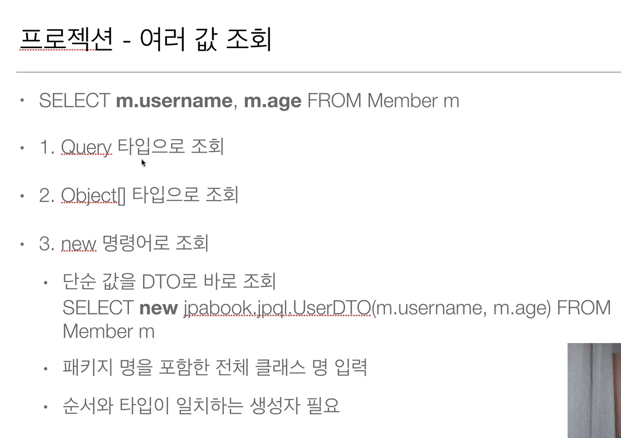 - SELECT m.username, m.age FROM Member m => 스칼라 타입 프로젝션