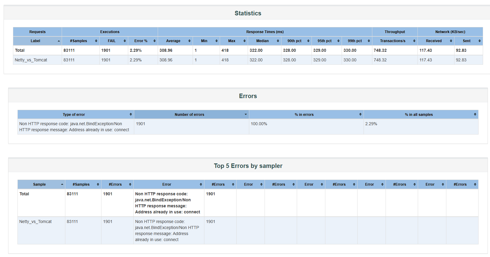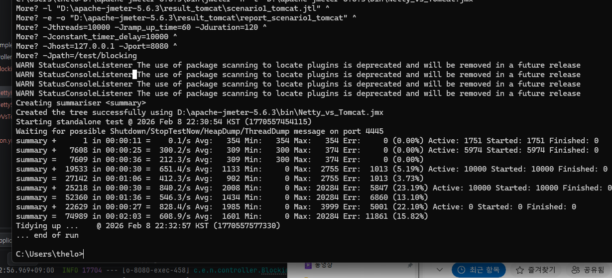 Netty의 처리 속도가 너무 빨라서 JMeter(보내는 쪽 PC)의 체력이 먼저 방전된 상황입니다.