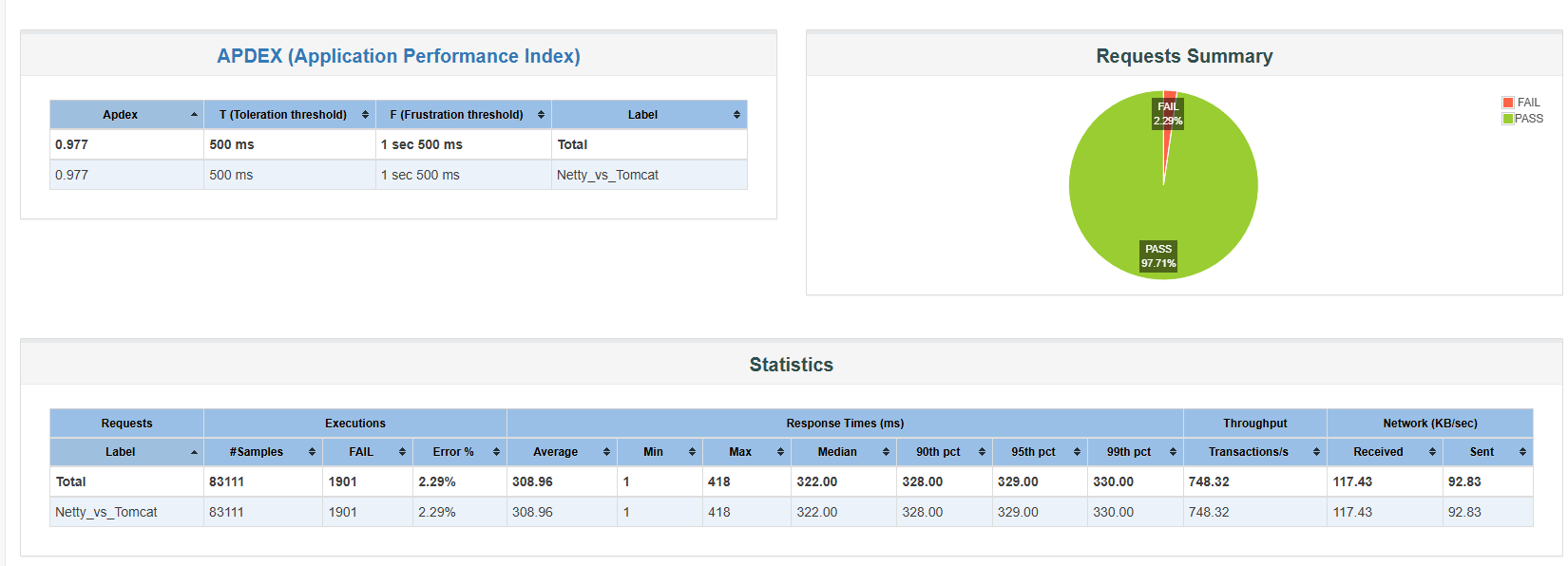Netty는748.32 transactions/s이며 Network상에서는 117.43 KB/sec를 받고 92.83 KB/sec를 보낸다.