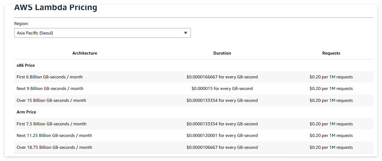 실행 시간(Duration)의 경우 x86의 경우 GB*시간당 요금과 Arm 의 요금이 다르니 참고하도록 하자.