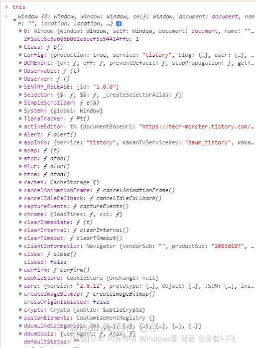 chrome 에서 f12를 눌러서 this를 출력하면 다음과 같이 나온다.