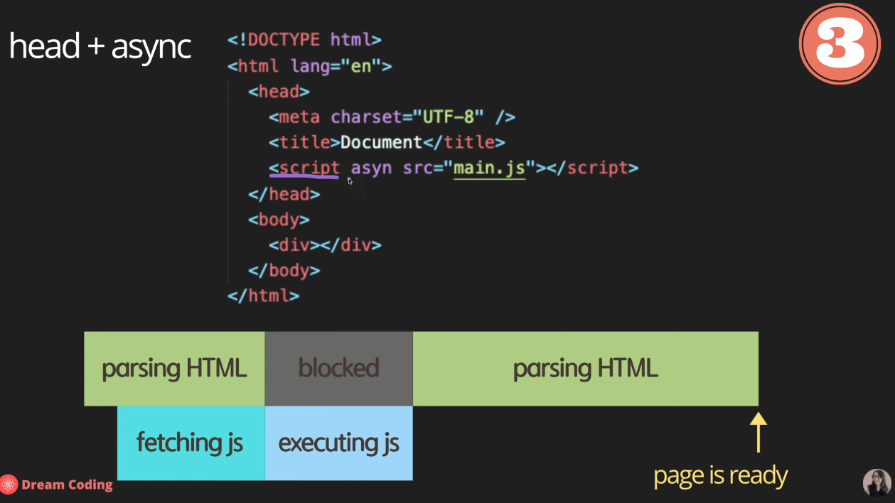 이렇게 되면 먼저 html를 모두 parsing하고 나서 페이지가 준비가 된 다음에 스크립트를 만나서 서버에서 받아 실행하게 된다.