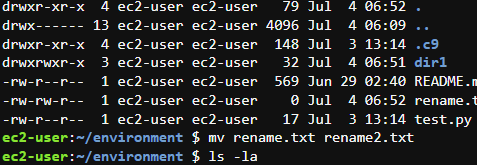 mv : 이동명령어 -> 이름바꿀 때는 이름 변경 파일 안에 그대로 놓으면 됨