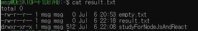 위 사진의 맨 밑에 보면 ls -l > result.txt로 했다.