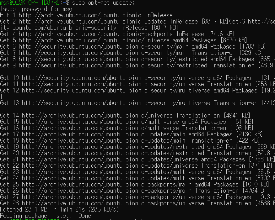 우선 명령어로 sudo apt-get update;를 입력하게 되면