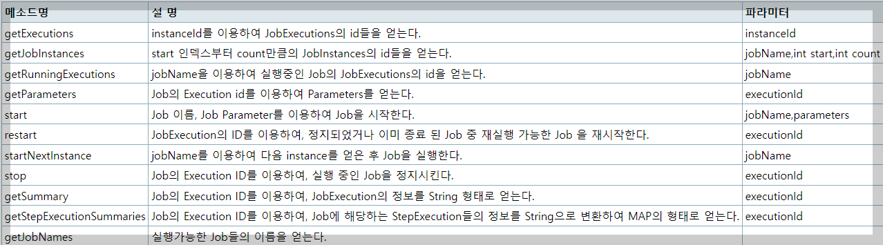이번 시간에는 지난에 보던 글에 이어서 JobRegistry부터 다시 읽어볼 것이다. (지난 내용이 궁금하면 여기 클릭!) 1. JobRegistry JobRegistry(그리고 그 부모 인터페이스인 JobLocator) 는 강제적이지는 않지만 context에서 어떤 잡이 사용할 수 있는지 추적하길 원하면 유용할 수 있다. 또한 context가 어디서든지 생성되어왔을 때 application context안에서 job을 중앙에서 모으기에 유용하다. 또 등록된 잡의 다른 속성이나 이름을 수정하기 위해 커스텀 JobRegistry 구현체를 사용할 수 있다. @EnableBatchProcessing을 사용할 때 JobRegistry가 제공된다. 다음 예시는 자신의 JobRegistry를 설정할 수 있는지 보인..