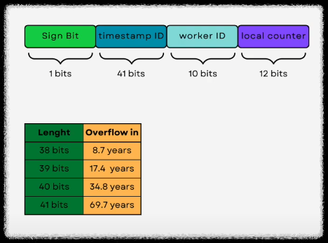 그림을 보면 41비트의 timestamp로 PK 를 생성시에 최대 69.7년을 겹치지 않는다고 한다.